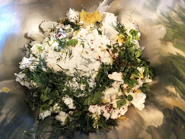 Meanwhile, I made the tzaziki topping: mixed Greek yogurt with lots of crumbled Feta (the good stuff), lots of chopped mint and dill, lemon zest, and a splash of white wine vinegar. Oh: added salt and Aleppo pepper too.