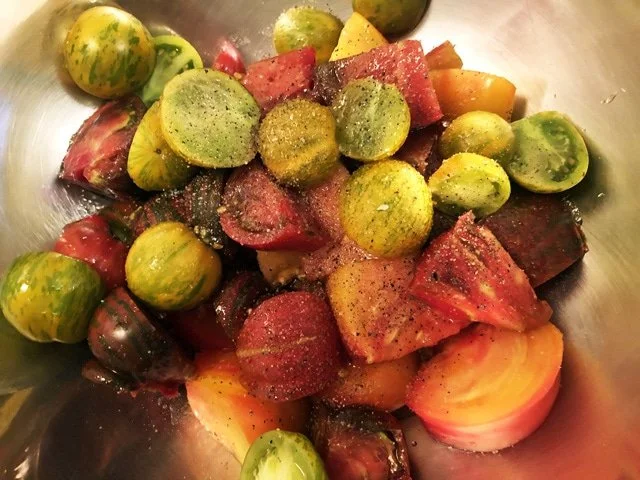 Finally, in another bowl, I cut the tomatoes into chunks and tossed them with olive oil, red wine vinegar, salt, pepper, some more of the Feta, and some more of those herbs.