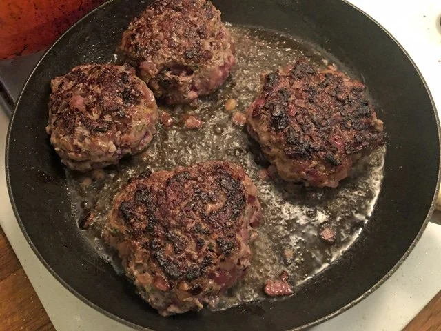 In the same skillet that I cooked the onions (a Scanpan), I wiped out the onion bits and put the skillet on high heat. When it was nice and hot, I added the burgers and let them sit, undisturbed, for three – four minutes. When they were nice and charred on the bottom, I flipped them.