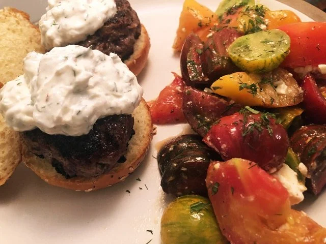 I looked up a recipe — Anne Burrell’s did the trick — got the ingredients I needed (lamb, buns, yogurt, Feta, mint, dill) and also grabbed some heirloom tomatoes, because now is the time to eat tomatoes with everything.