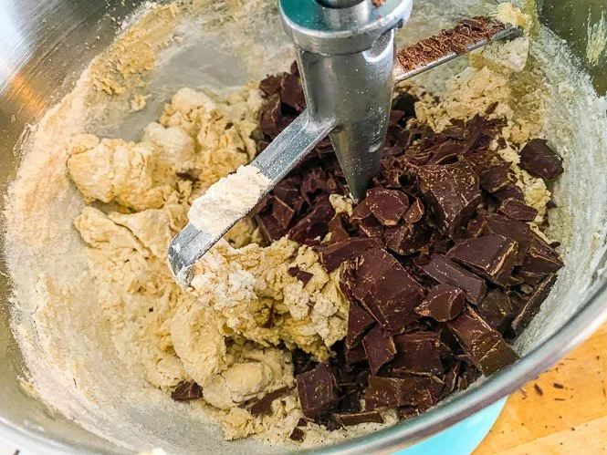 Add the eggs and mix for no more than 1 minute; the eggs will not be fully incorporated. Turn the speed down to low and add the dry ingredients in thirds, beating until just combined. With the mixer running, sprinkle in the chocolate chunks, beating until just combined.