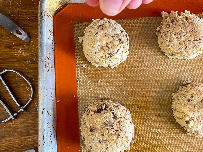 Using a large ice cream scoop or a 1/4-cup measuring cup to form the cookies and place on the prepared cookie sheets, leaving 2 inches between the cookies to allow for spreading. Lightly tap each cookie with the palm of your hand and sprinkle the cookies with fleur de sel.