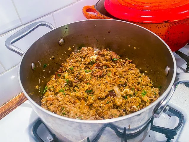 In that same skillet, heat another 3 tablespoons of olive oil, and add half of your mushrooms, plus a pinch of salt. Allow to sizzle; if no liquid is released, add a splash of water and let the mushrooms simmer until the liquid evaporates. Continue to sear until the mushrooms are a deep brown. Carefully add a splash of Balsamic vinegar — don’t shake the pan too much or the oil might ignite! — and cook until the liquid is absorbed. Stir the mushrooms into the freekeh and repeat again with the second batch of mushrooms.
