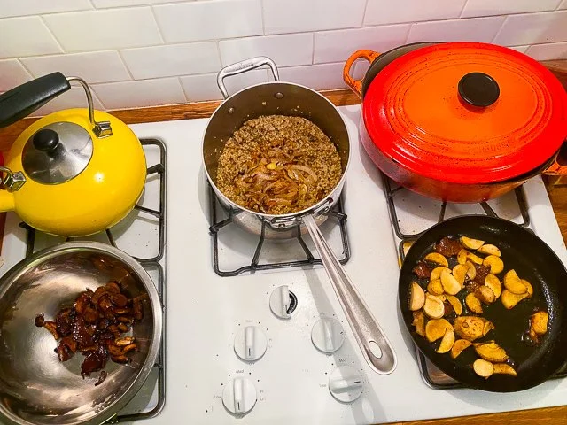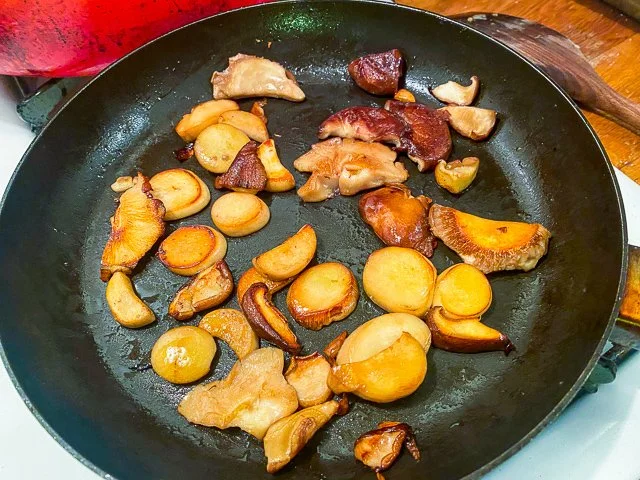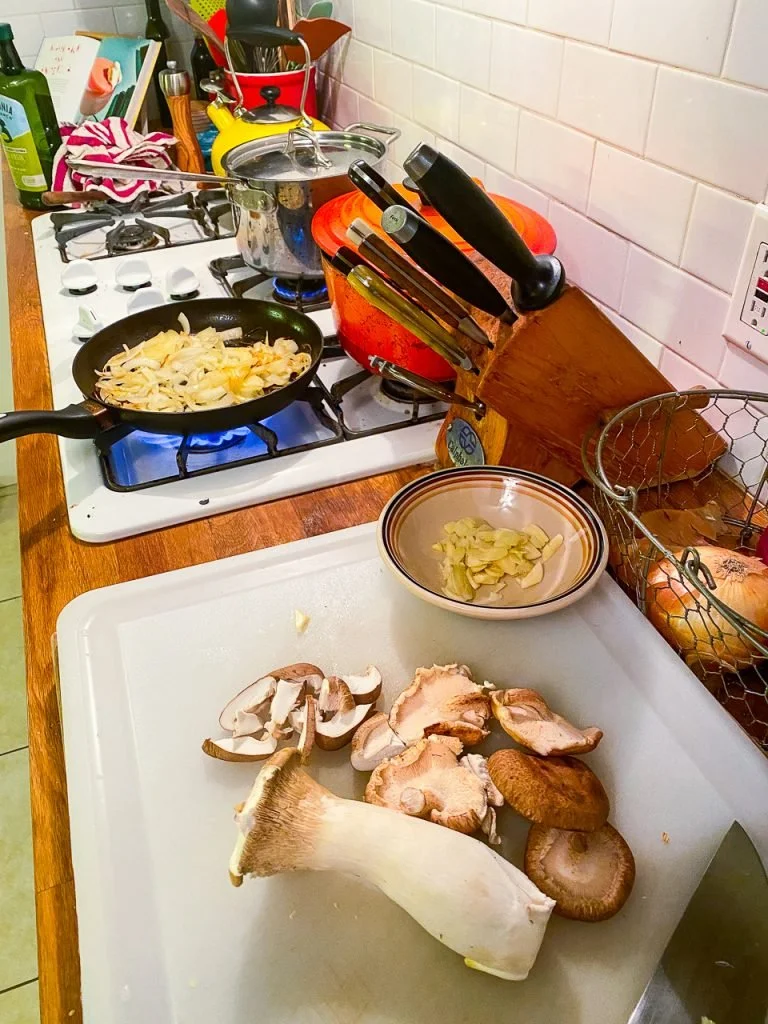 So, in this case, I cooked the onions and garlic in a pan, as he suggests, and then I seared the mushrooms in that same pan. I used my strange technique of adding olive oil, getting it hot, adding the mushrooms, letting them color, and then — here’s where it gets strange — adding a splash of water. I do this because I don’t love the texture of mushrooms that don’t cook down a bit in liquid; it gives them a chance to soften and cook through before the water evaporates and they sear again.