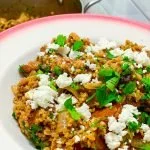 To finish, stir in Urfa chili to taste (it takes a lot to really taste it). Add chopped parsley and as much Feta as you like. You can eat it right away or let sit and eat later.