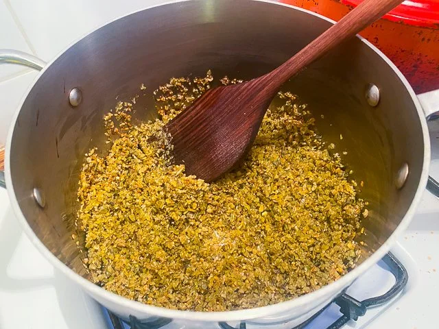Freekeh, as mentioned twice now, is an ancient grain, a superfood like quinoa, spelt, and farro, that’s made from wheat harvested early. I cook it, according to the package directions, by toasting it in olive oil (similar to how I toast oatmeal in the morning), then adding water, salt, pepper, and letting it simmer with the lid on for thirty minutes.