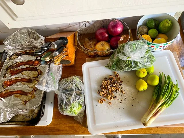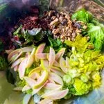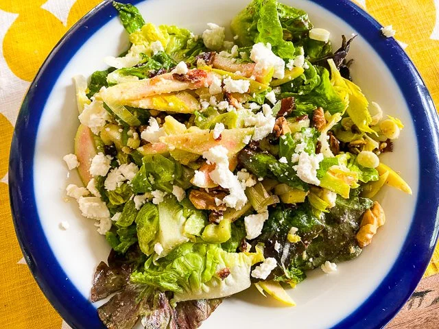 As for the dressing, I whisked together a big spoonful of Dijon, a splash of Sherry vinegar, and enough olive oil to emulsify. I do all of this in a big bowl, then pour all of it out, add the lettuce, the celery, the apples, the spring onions/shallots (scallions are a good alt), the chopped toasted walnuts, and the chopped crispy bacon, and toss everything with just the residual dressing and add more if necessary. Then, at the very end, I add some crumbled Feta (Roquefort would’ve been more ideal, but Feta was a good substitute).
