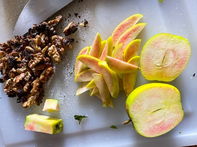 As you can see, this is not a Waldorf salad — no mayonnaise, no grapes, it’s not gloppy — but it’s in the world of a Waldorf salad. And that key combination of apples, toasted walnuts, crispy bacon, and cheese (either Feta or Roquefort) is so dreamy, you can call it whatever you want, you’ll be too busy stuffing your face to worry about a name.