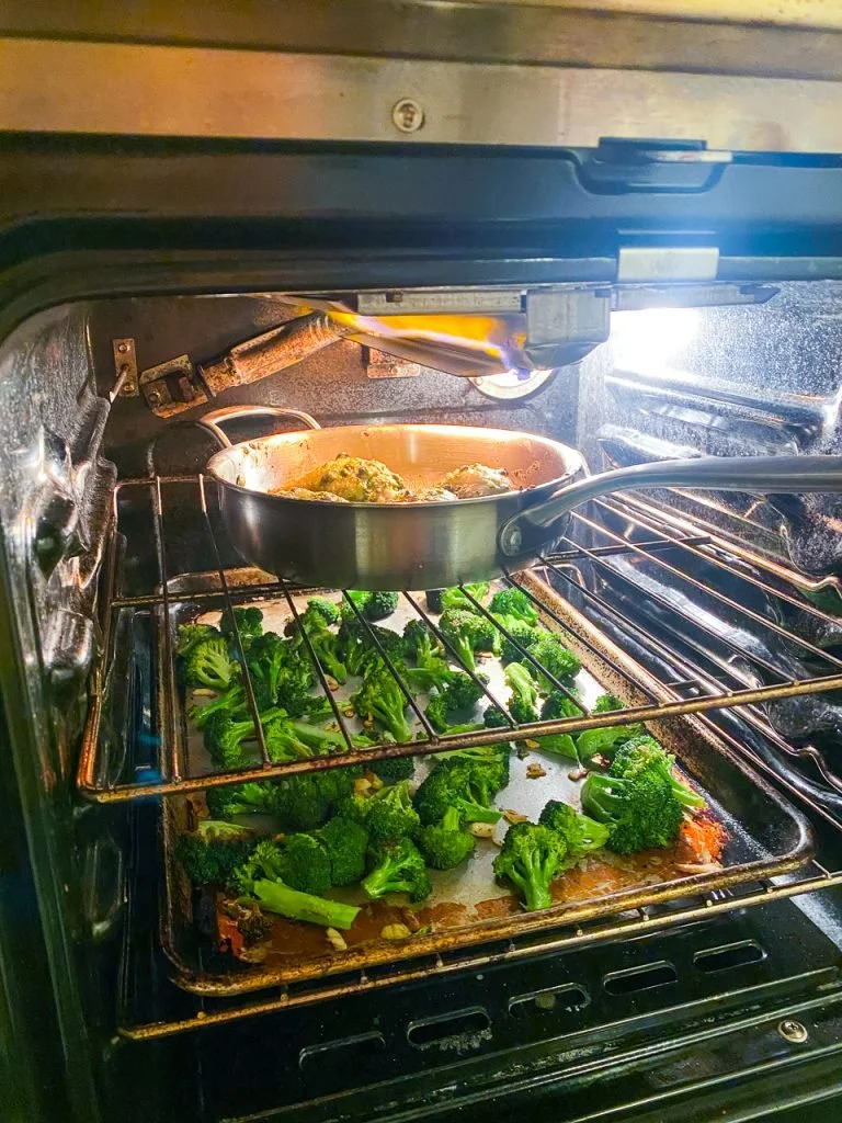 Finally, I had some leftover arugula pesto from the pasta night, so I slathered it all over some chicken thighs and also shoved some of it under the skin. I put the thighs into a skillet and roasted in the oven at 425 until they registered 165 on a thermometer and then, unhappy with their color, I blasted them under the broiler while, on the lower shelf, I was making the best broccoli of your life.