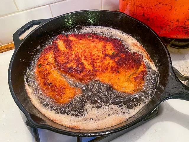 Heat 1/2 inch of neutral oil in a cast iron skillet and when it’s hot (toss in a few breadcrumbs; if they sizzle, it’s hot), carefully lower in your chicken and fry until deep golden brown on one side, then finish on the other side.