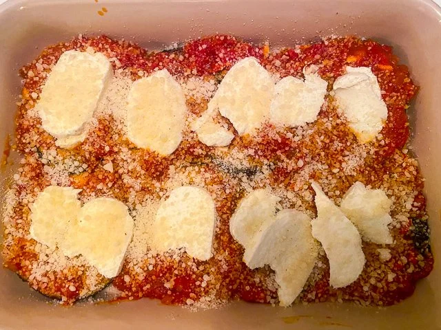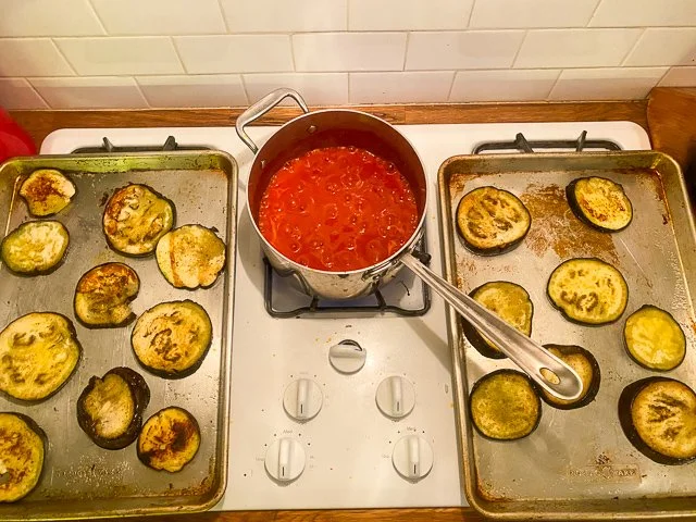 To assemble, you layer in the roasted eggplant, the sauce, slices of fresh mozzarella, lots of Parmesan cheese…