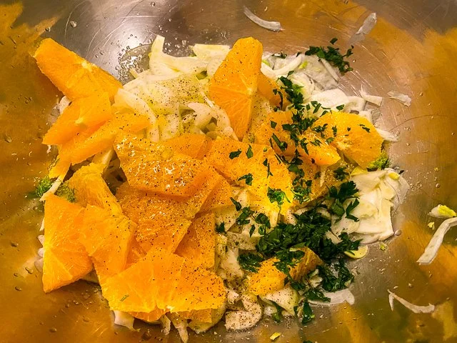 To serve, I made a fennel orange salad by slicing fennel on a mandoline slicer (one of the best times to use your mandoline is for fennel), cutting the peel off the orange and then slicing, and adding a good glug of olive oil, a splash of white Balsamic, salt, pepper, and chopped parsley.