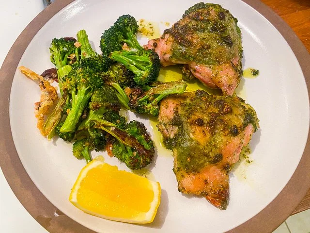 Meal Five: Pesto Chicken Thighs with Roasted Broccoli.