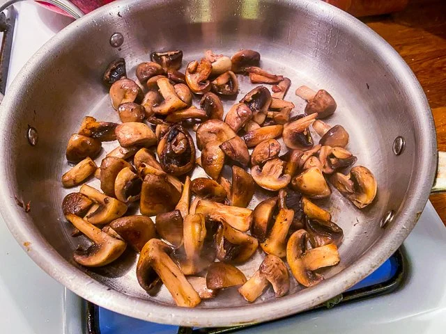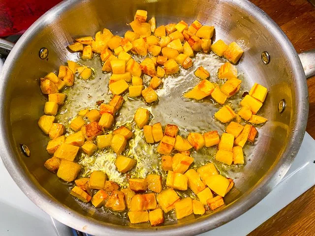 The first step was to cut the Delicata squash into cubes and to brown it in olive oil. That’s really all there is to it: take the seeds out, cube it, brown it. Then clean the mushrooms, slice in half, and use the remaining oil to cook them.