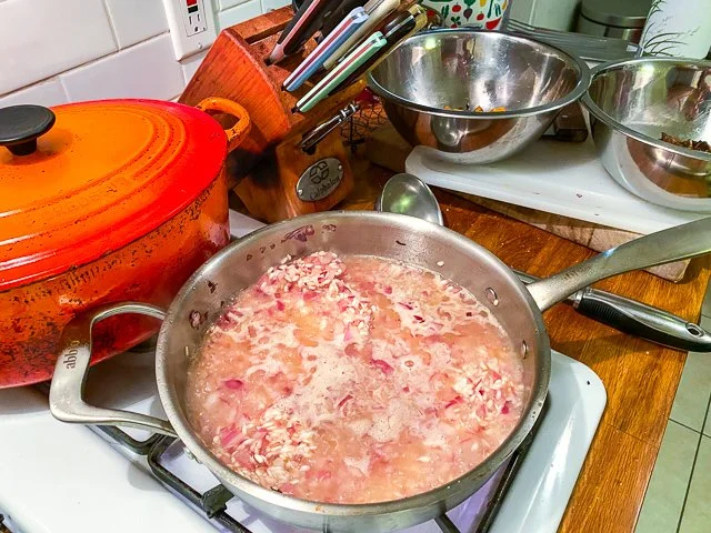 4. Let the pan cool for a moment, then add another splash of oil and your red onion, plus a sprinkling of salt. Cook the onion until transluscent, then add the rice. Toast the rice along with the onion until thoroughly coated with oil, then add the white wine. Lower the heat so it evaporates at a simmer, not a boil.