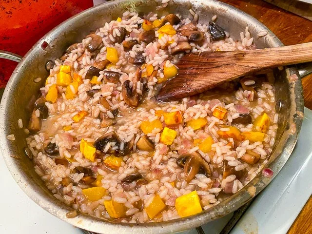 Cook at a simmer, stirring all the while, and keep ladling in the water as it evaporates. The whole process should take about twenty minutes. You can start adding your mushrooms and squash about halfway through.