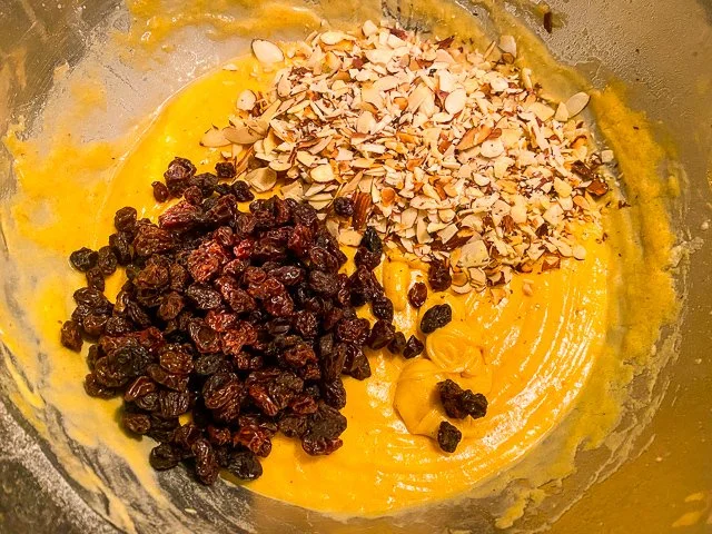 He also calls for walnuts or pecans, but I only had slivered almonds. So I toasted those, chopped them, and added them along with the raisins.