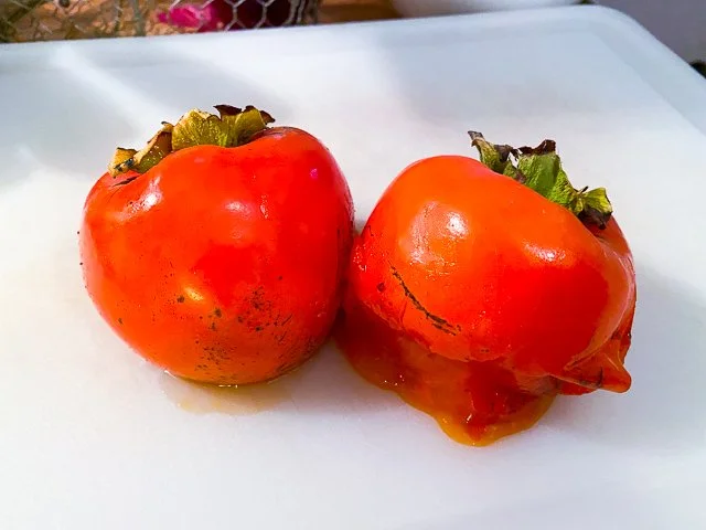 These are hachiya persimmons. You know because they’re acorn shaped and they’re only edible when they get squishy like this. (The other kind, fuyu persimmons, you can eat like an apple.)