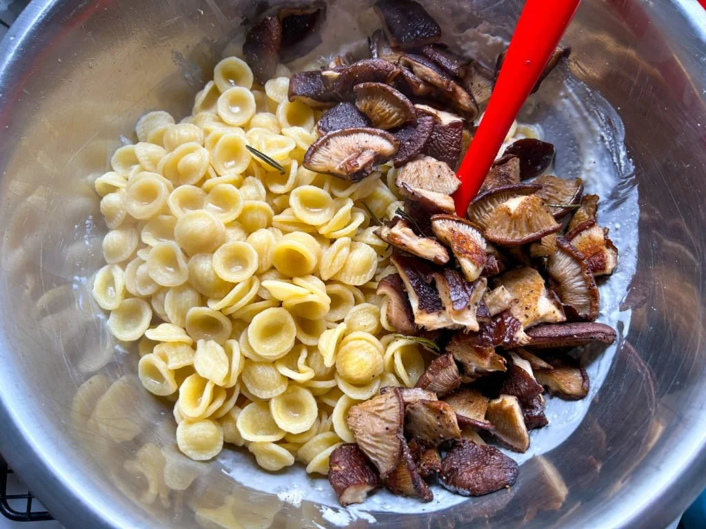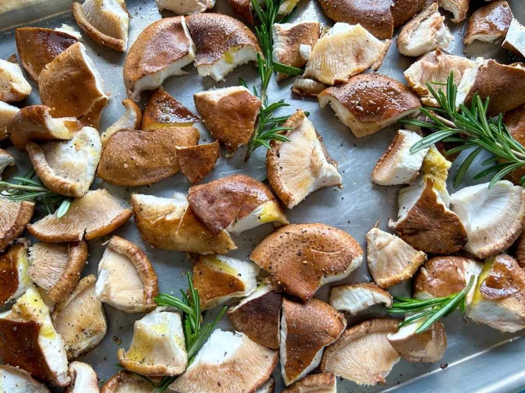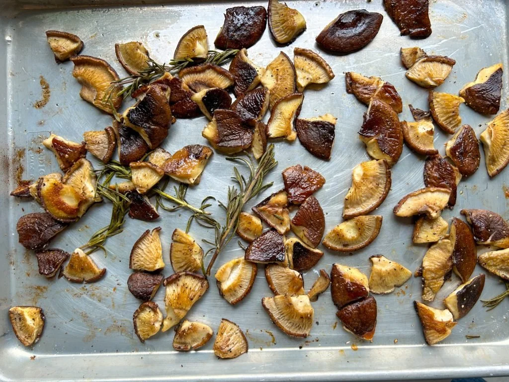 1. Preheat the oven to 450. If you’re using mushrooms that need to be stemmed, stem them! (Shiitakes need to be stemmed and the stems need to be discarded.) Tear the mushrooms into one-inch pieces and toss them with the olive oil, salt, pepper, and rosemary and place on a cookie sheet. Roast in the oven, tossing every five minutes, until deeply burnished brown on the edges. Set aside.