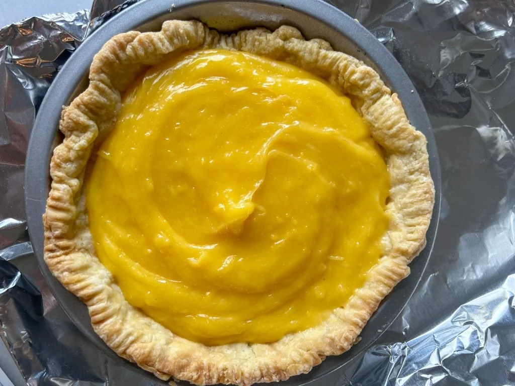 Place the pre-baked pie crust on a parchment or foil-lined cookie sheet. Pour the custard into the crust and set aside while you make the meringue.