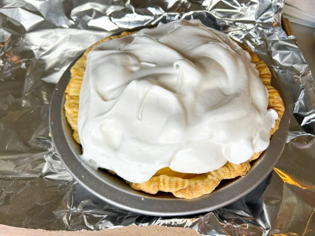 What a miracle meringue is. Not only does it add height to your pie, you can spread it around as much as you need to in order to hide the cracks.
