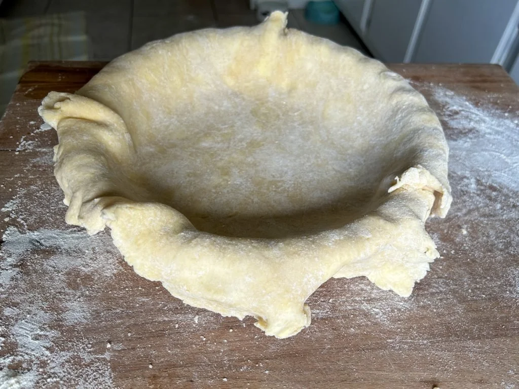 Over the years, I’ve gotten more confident at making pie crust. My technique is to do everything in the food processor and to work quickly. I add more water than the experts tell you to, to make it easier to roll out. And then I knead it a little on the counter to make the dough come together without overworking it.
