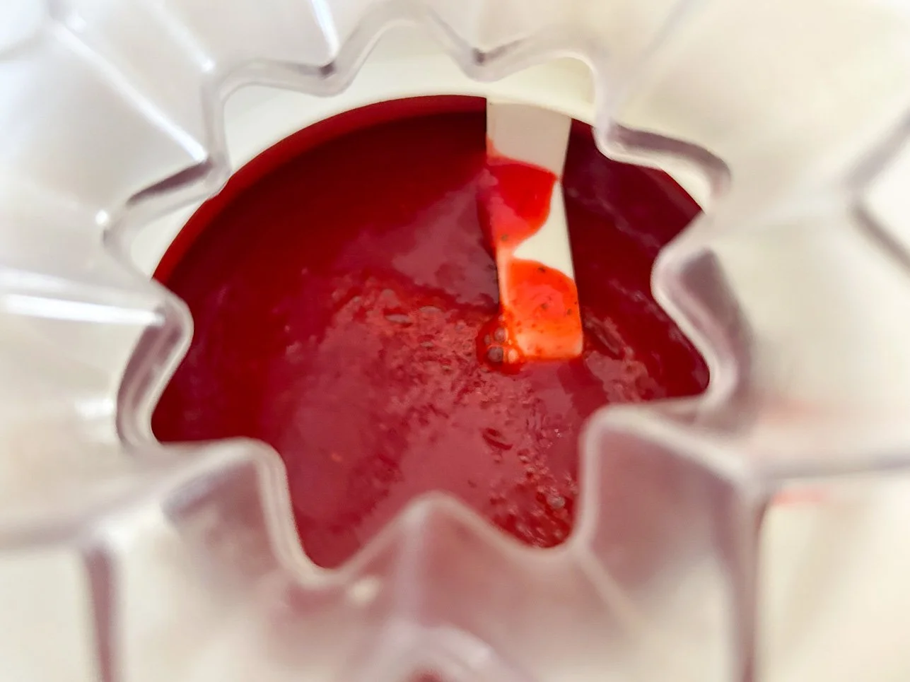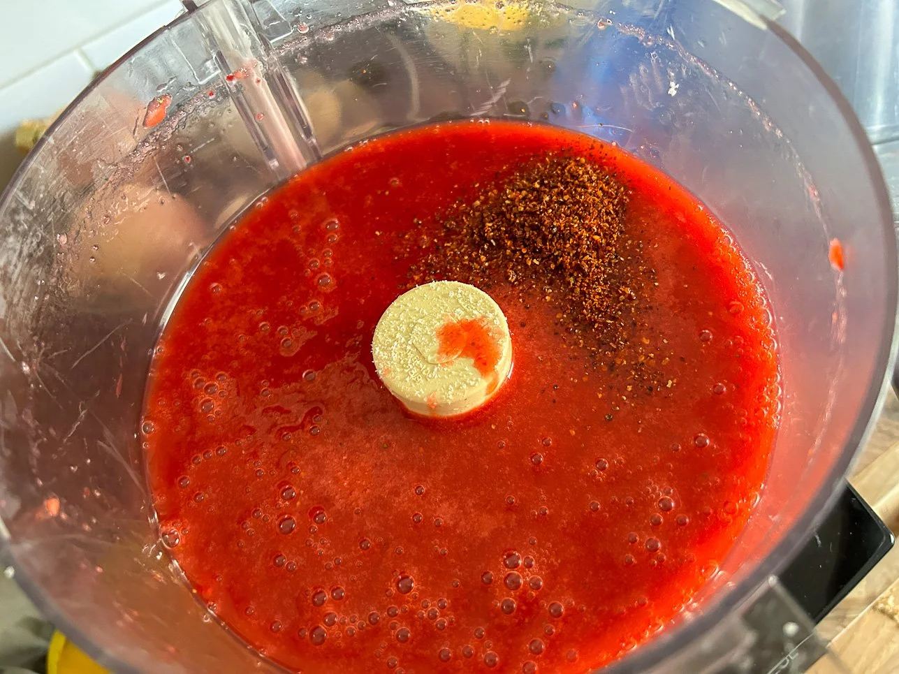 Now for the fun: add the Framboise, the Kashmiri chili powder, and Aleppo pepper. Blend and taste. Adjust for heat — if you like it sassier, go for it.