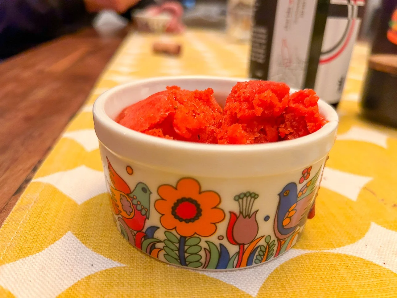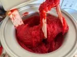 After straining the sorbet base (make sure to press with a rubber spatula to get all the liquid through), I chilled it in the fridge for two hours and then churned. When it finished churning — see lead photo — it was pure joy to taste a little off my tasting spoon and to see how the chilies and lemon juice and Framboise all helped the strawberries pop. This sorbet was alive, baby!