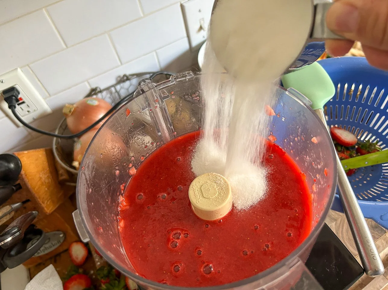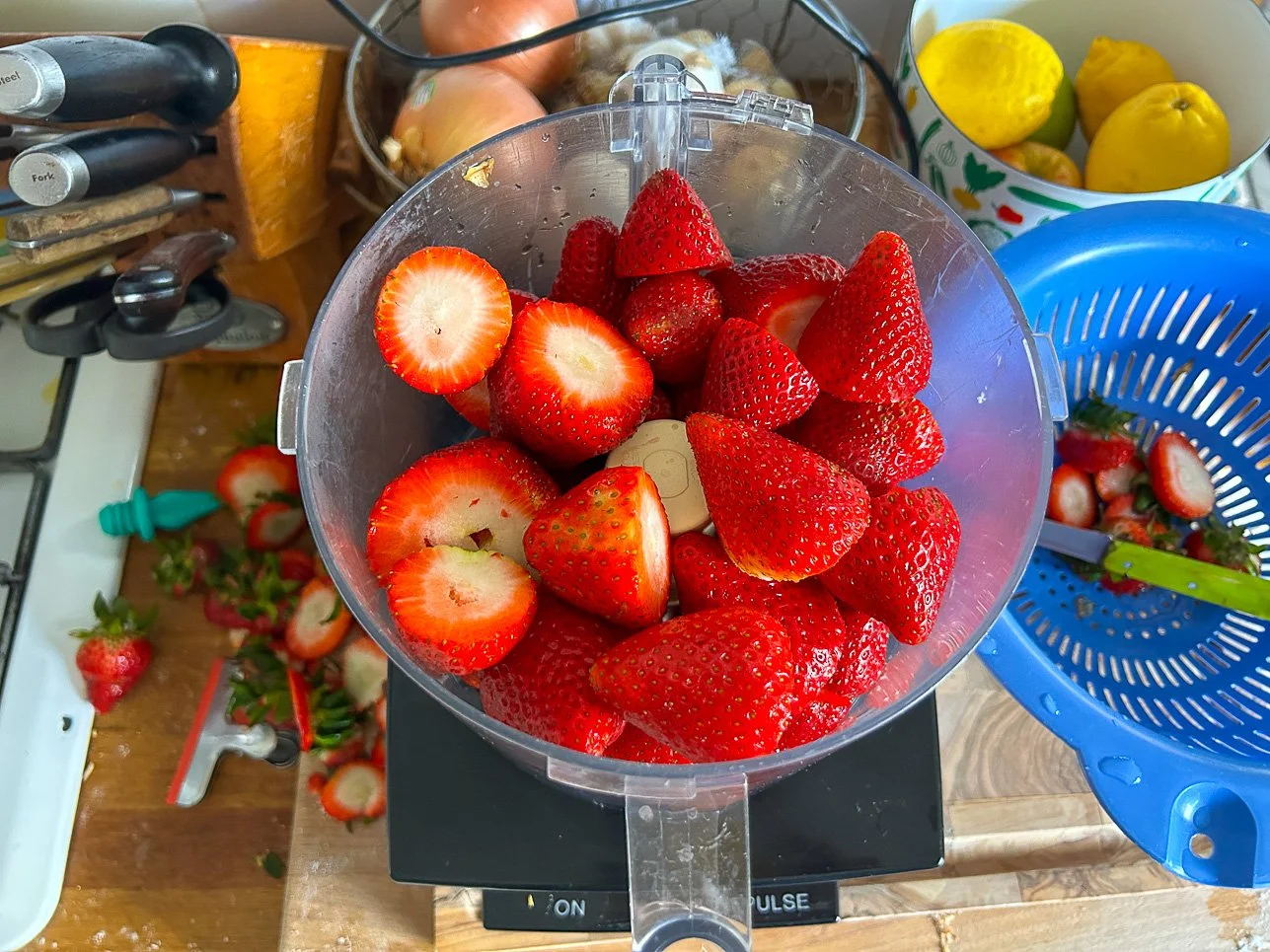 Don’t show David Lebovitz this picture: I’m going to get yelled at for cutting the strawberries the wrong way! You’re actually supposed to hull them. I even have the right knife for it. But some of us have children to raise (okay, I don’t) and dogs to walk (I do), so forgive me my slicing method. The point is: they go into the food processor and you blend them. It’s really not that hard.