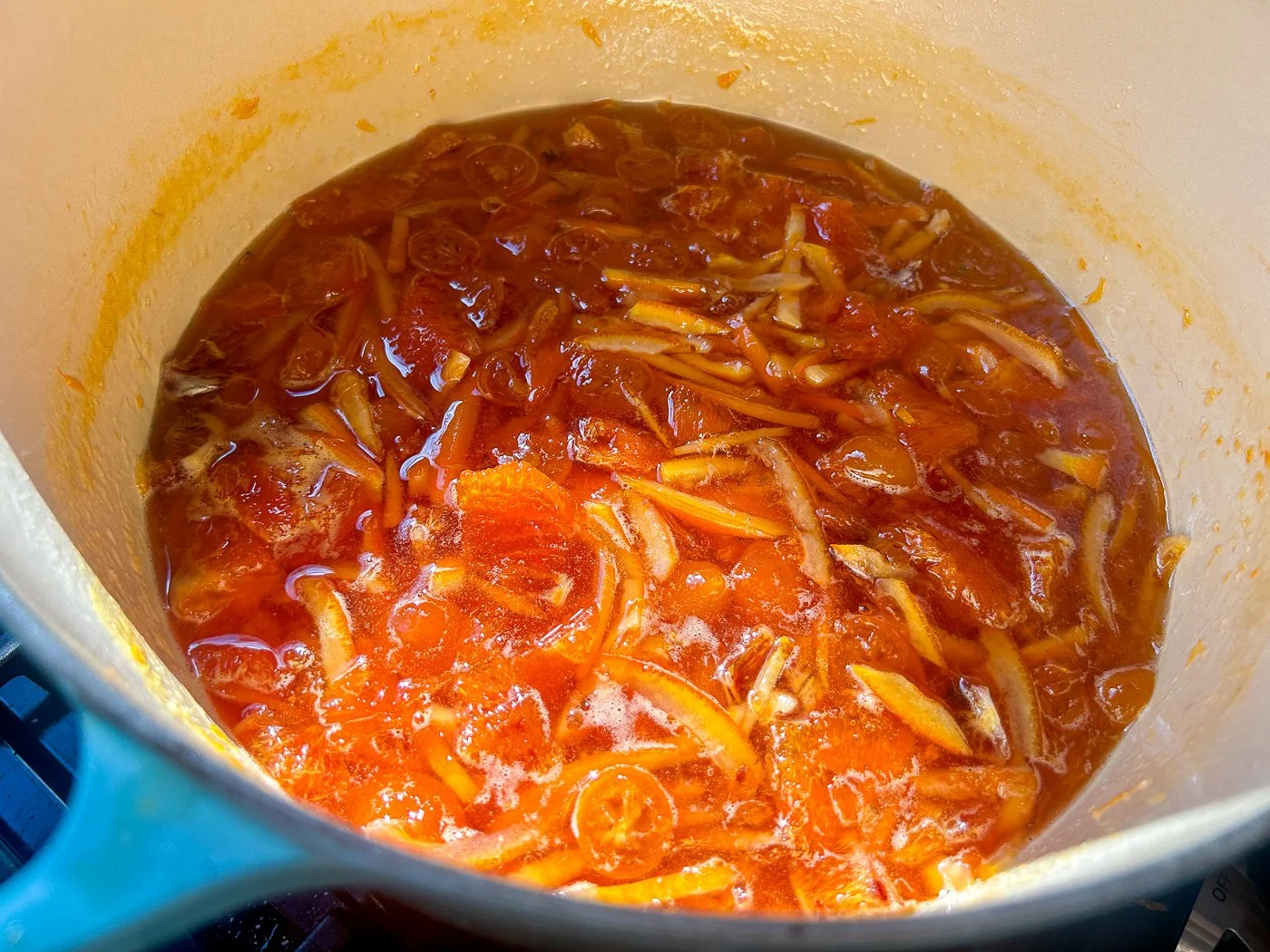 I should say here that I made the mistake of putting this into jars when I didn’t really pass the wrinkle test. You’ll know you’ve failed the wrinkle test if the marmalade stays super liquidy after sitting for a while. Don’t worry — you can do what I did. Which was essentially to put everything back into the pot, bring it back to a boil, and cook for another 5 to 10 minutes until I absolutely, without question, passed the wrinkle test.