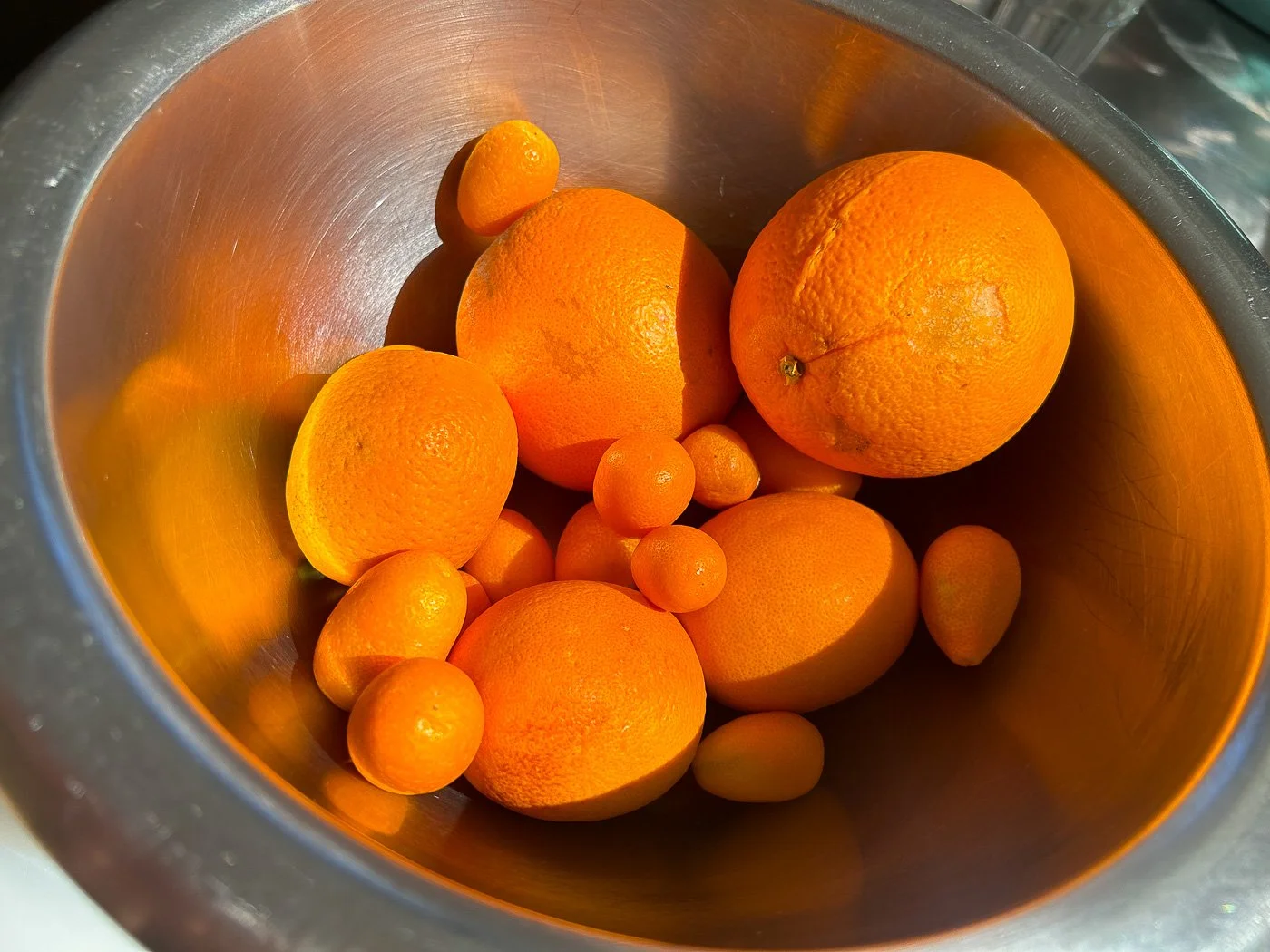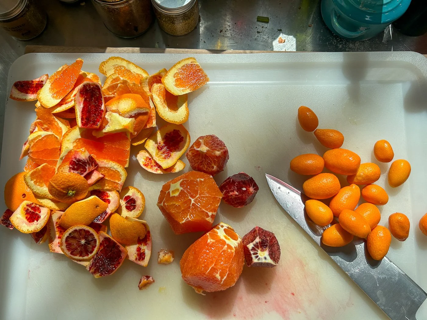 Normally Seville oranges are considered the best oranges for marmalade because of their bitterness and sourness — qualities that play neatly off the sugar — but in my fruit bowl this weekend I found Cara Cara oranges (they’re pink on the inside), blood oranges (they’re red on the inside), and kumquats. I weighted out two pounds worth, then got to work.