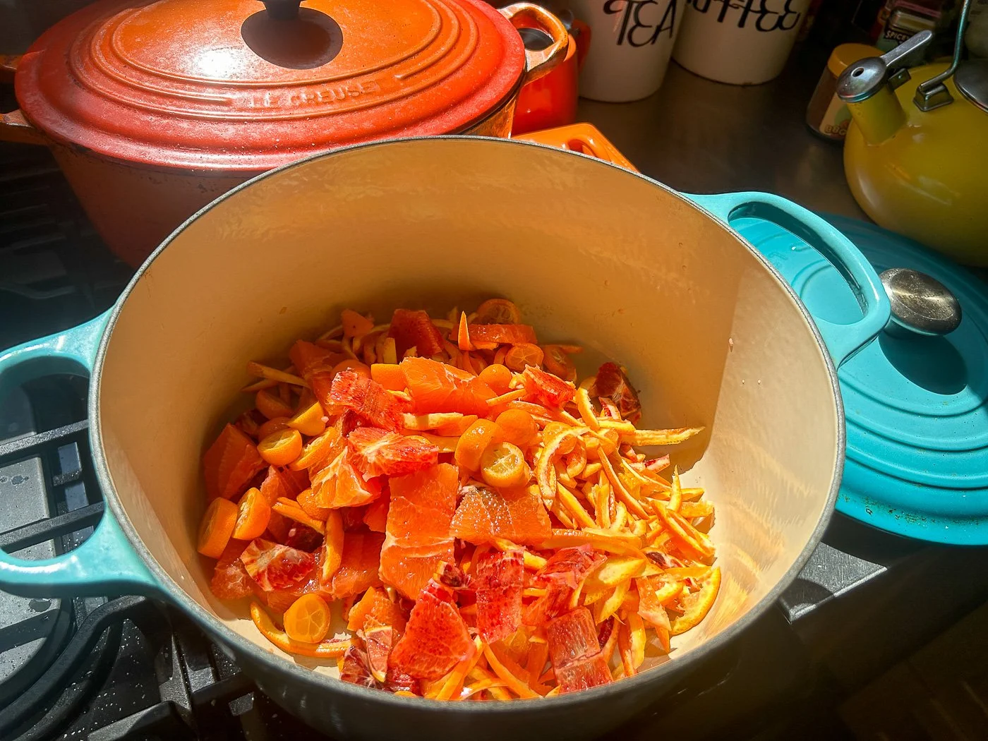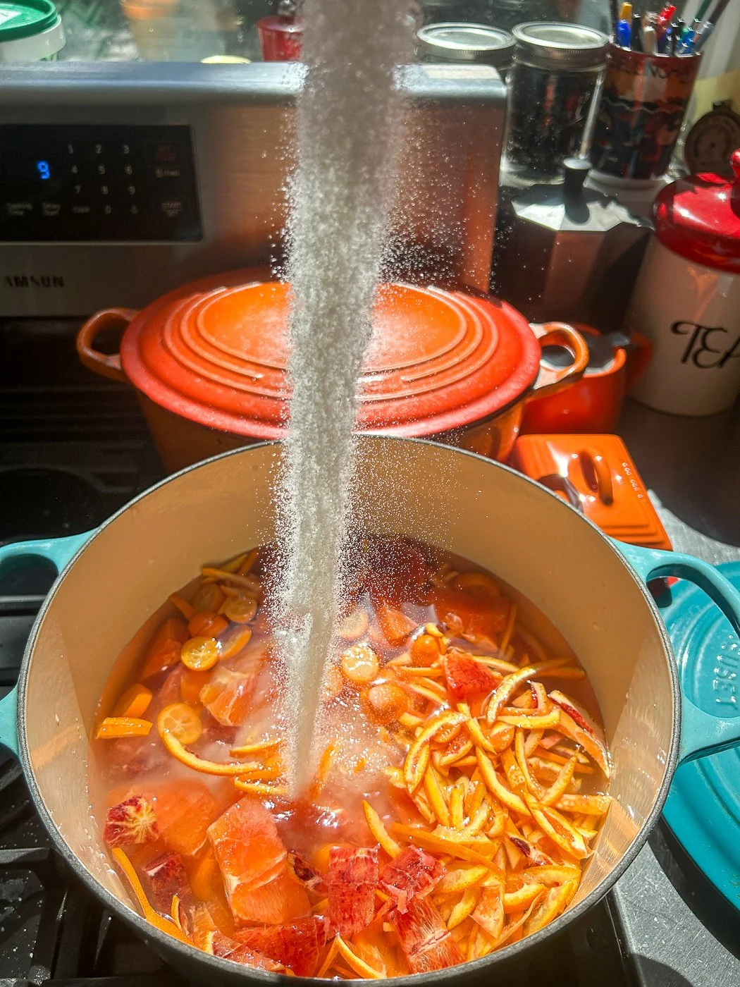 Then it’s time for sugar. You need a lot of sugar to make marmalade — them’s just the rules. So four cups of sugar, make your entrance.