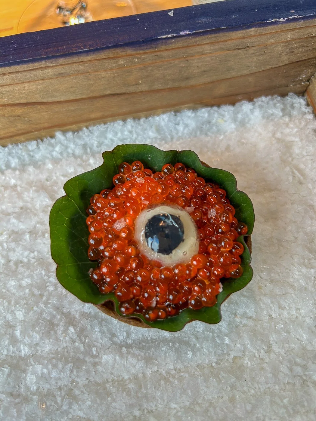 The waitress who served it explained that it wasn’t exactly a whole eyeball, it was just the white of the eyeball, and they used squid ink to make the pupil — as if that made it better?