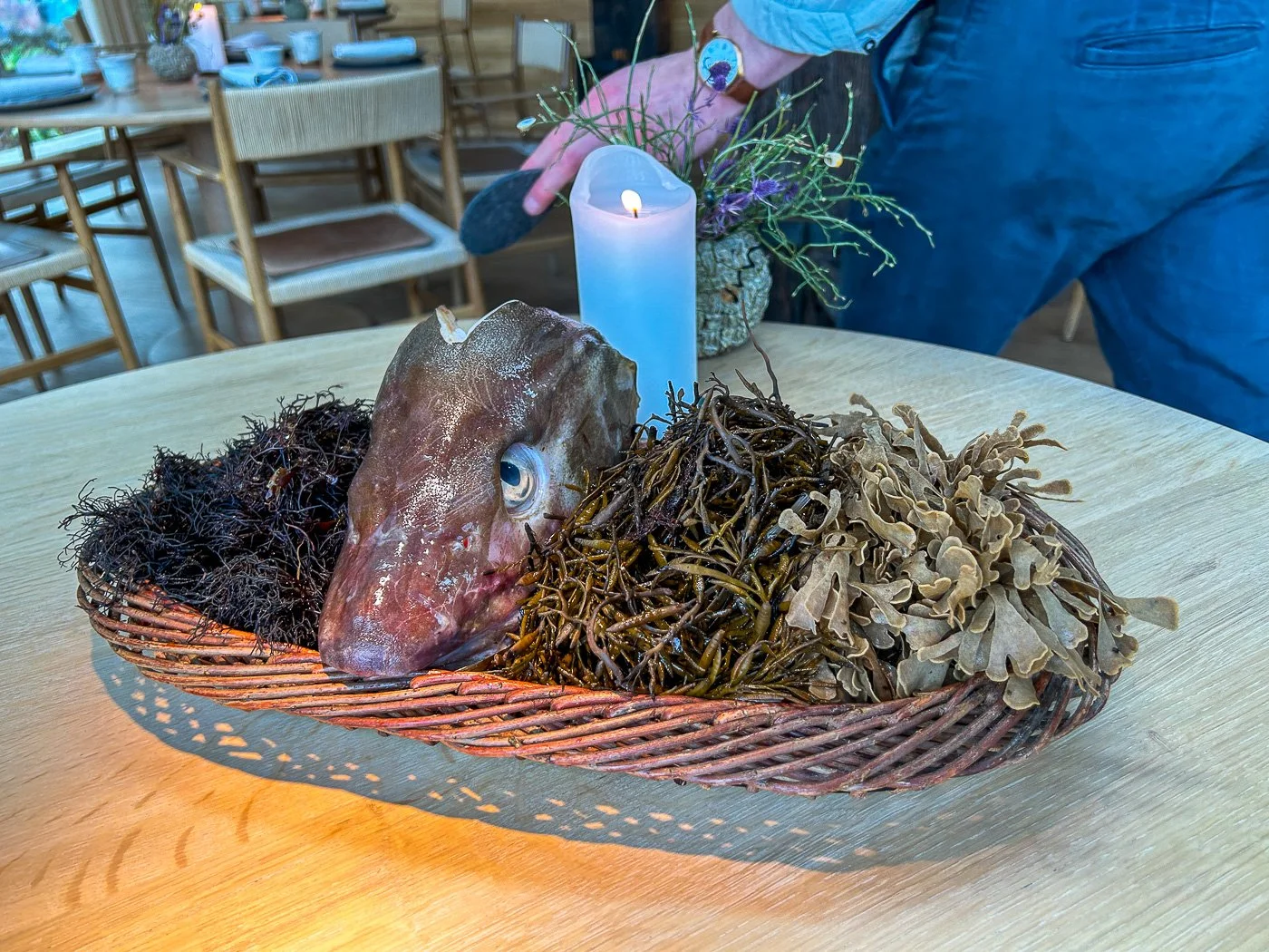 The lead picture of this post shows you the first thing that we saw when we sat down at the table: an entire cod’s head. An explanation was made about celebrating local ingredients, how the fish were all caught in Denmark or Norway, and how we were going to experience taste sensations from the ocean that we most likely had never experienced before.