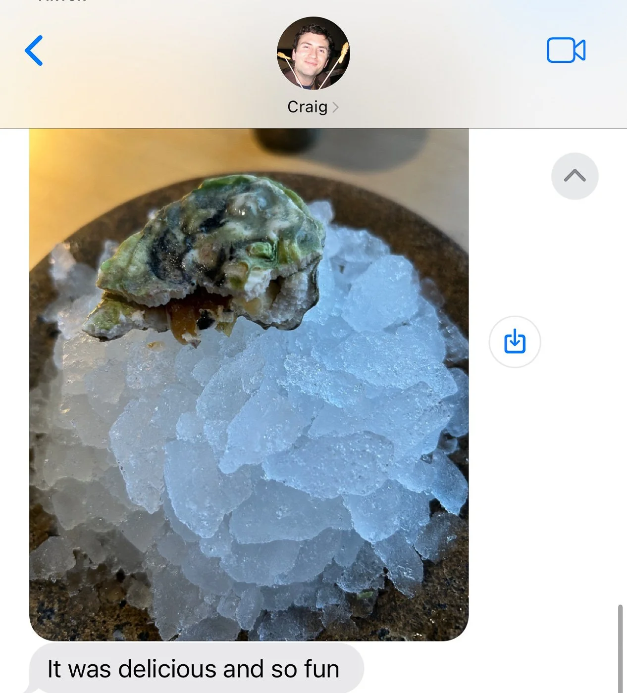 Craig, meanwhile, texted me throughout the rest of the meal, which he mostly enjoyed, especially this “sweet oyster” dessert which was really ice cream.