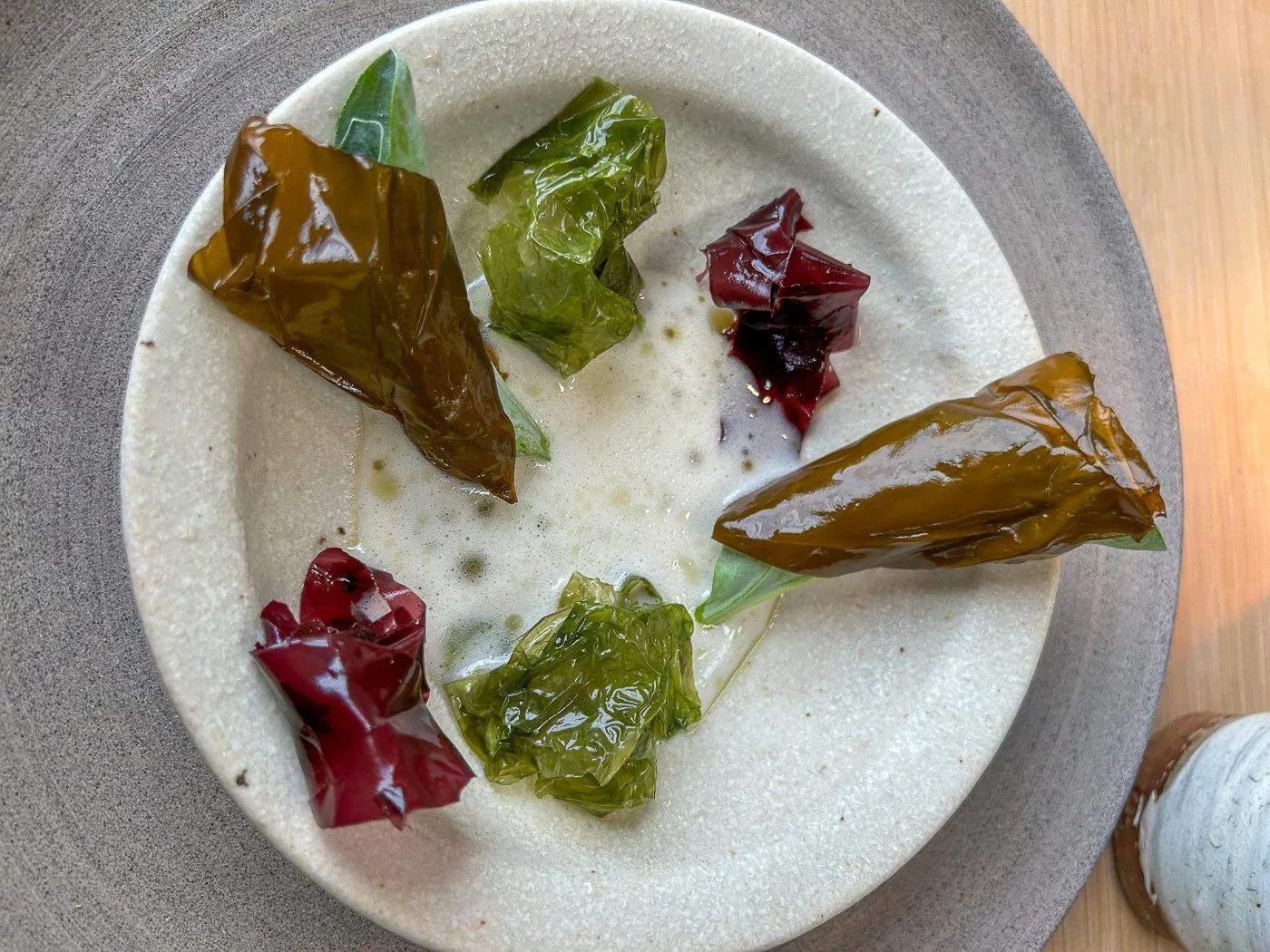 The next course was seaweed a la créme which was exactly as the name implied: pieces of beautiful seaweed (one wrapping an oyster leaf) over a creamy sauce. Sort of like eating the bottom of an aquarium, but a very clean one.
