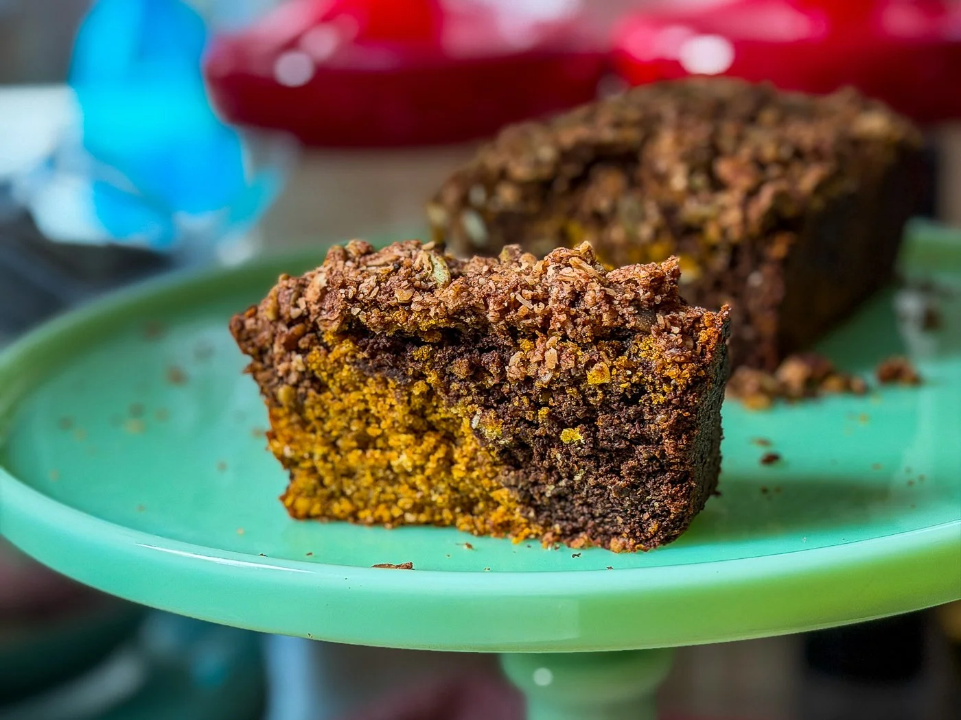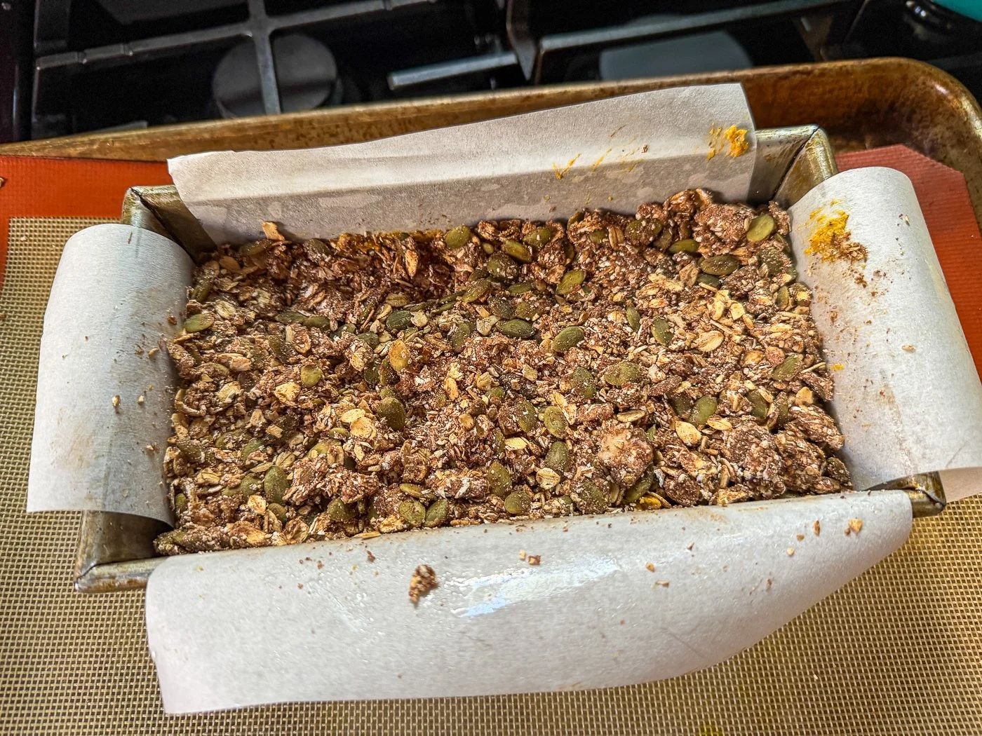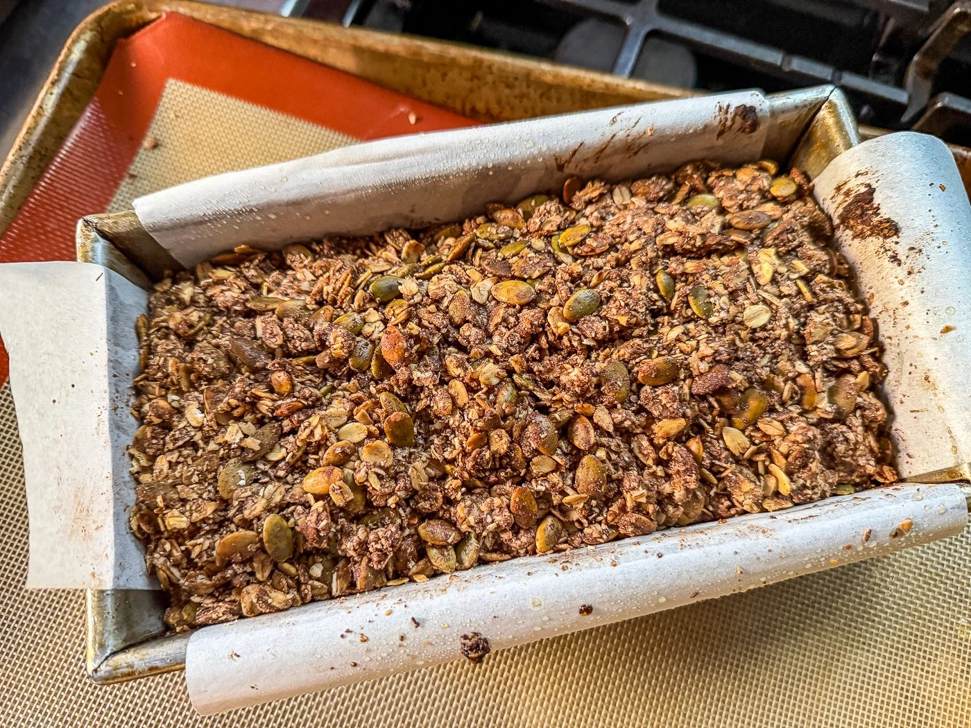 Finally, you make a streusel with pumpkin seeds, cocoa powder, more oat flour, and butter.