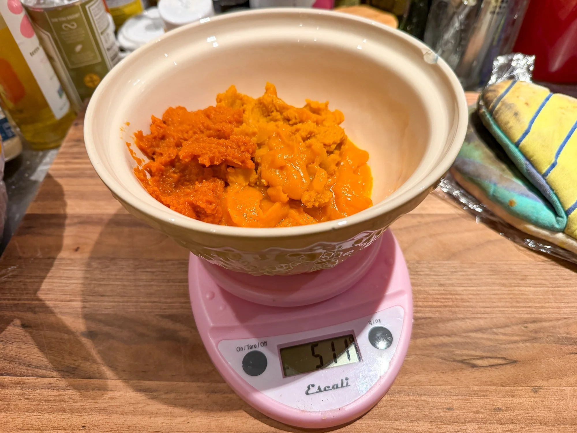 From there, it’s a quick trip to the food processor, where you blitz the flesh, press it through a sieve (told you this recipe was finicky), and weigh it out. You’ll want 510 grams, which this squash didn’t produce: so I supplemented with some leftover kabocha squash puree and (gasp!) Libby’s canned pumpkin (which, apparently, is also made with squash).