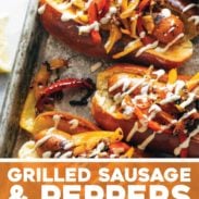 Love this combination of the savory sausage, sweet veggies and creamy punchy aioli! We don’t have a grill, but I used a cast iron skillet to first sear the sausages and then cook the peppers and onions. Also added some chives from our garden to the aioli. Thanks for a super easy and tasty recipe!