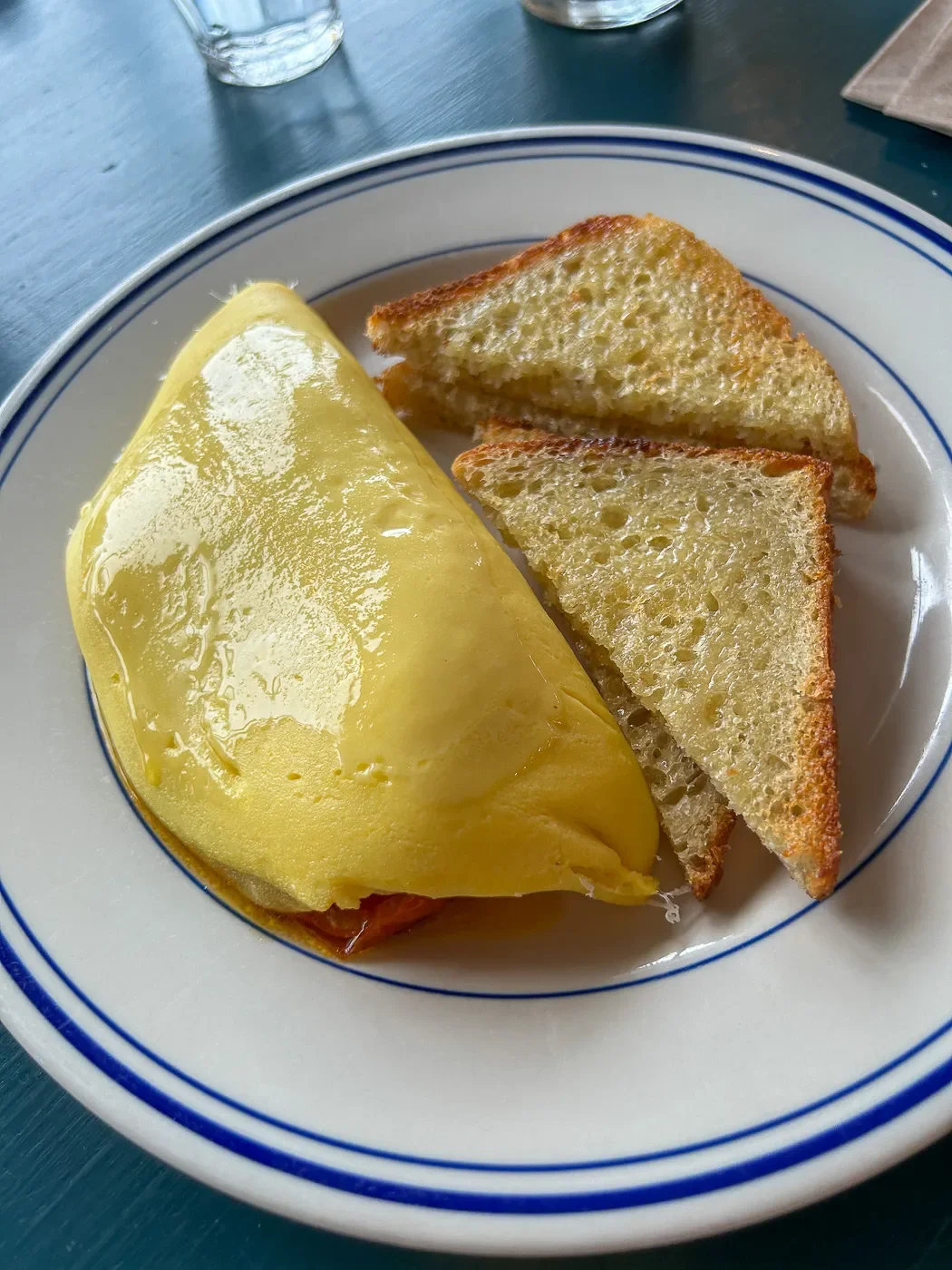 My omelette with roasted tomatoes and pecorino wasn’t just sublime, it was highly unusual. I have no idea how they shellacked the surface like that. (My guess? They rubbed it with more butter.)