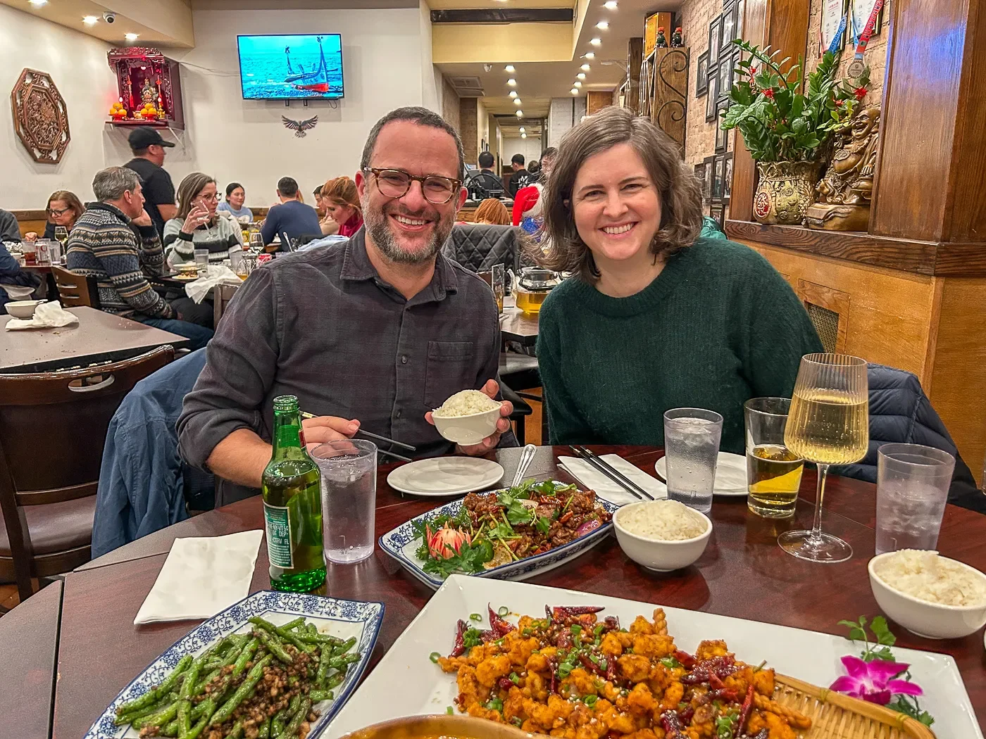 We loved everything that we ate, but highlights were the potted tofu (the dish on the bottom) which came lots of chilies and peanuts on top; the spicy chicken with fried dough on the right; the cumin lamb up top; and the dry sautéed string beans on the left. I want to buy more theater tickets just so we can go back.