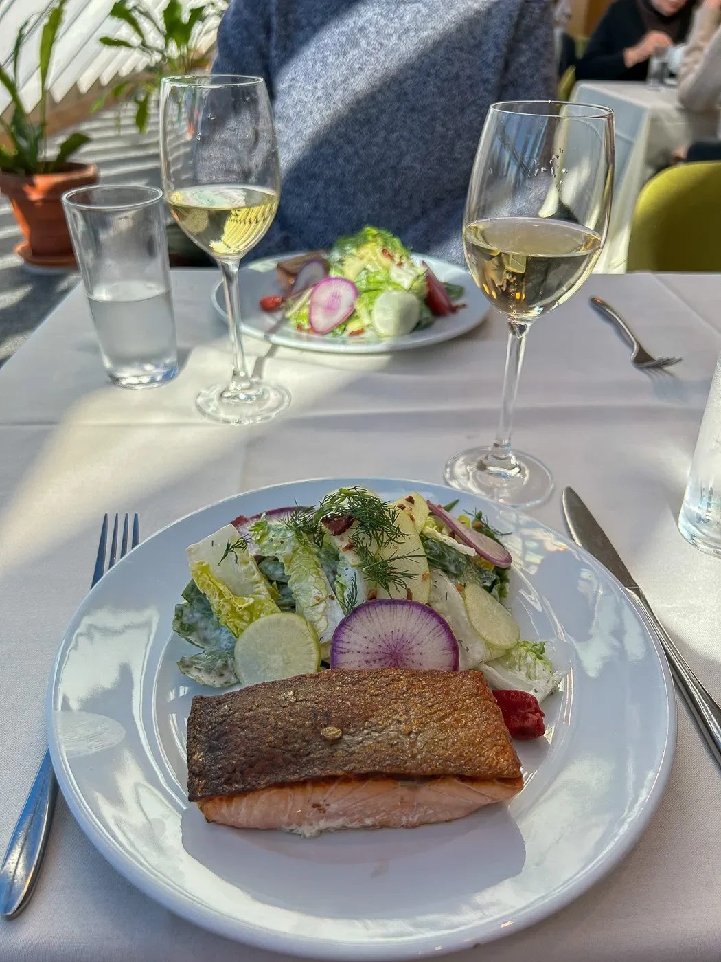 We had wine because it was my birthday (no regrets, coyote) and then I had the salmon and little gem salad, which was excellent and cheaper than the same thing at All Time in L.A.