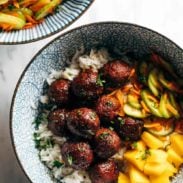 You’re going to fall in LOVE with these Sticky Ginger Rice Bowls! It’s a sweet-meets-spicy sauce situation, flavorful meatballs, pickled veg, and mango on top. The perfect (vegan) summery meal!
