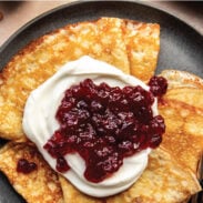 4. Serve: Serve them flat, folded, or rolled, topped with whatever you like: maple syrup, whipped cream, fruit, jams, etc. I like to fold them and serve with lingonberry jam and yogurt!